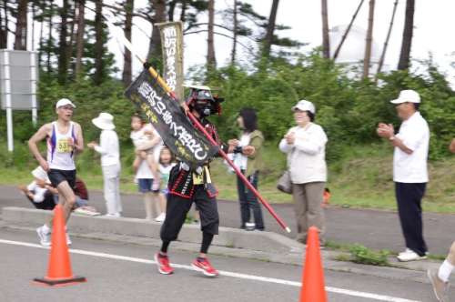 一般10kmに參加する選手は、記録狙い、あるいは勝負(fù)にかける意気込みもあってか、早々に入念にウオーミングアップを続けていました。なかには『去年はダスベーダーに扮したんです。今年は伊達(dá)正宗での參加』と、とにかくパフォーマンスを楽しもうという異色の仮裝ランナーも。この人もこの人なりに、準(zhǔn)備怠り無(wú)しという感じでした。