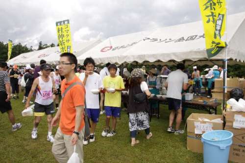 ランナーと応援が一體となったこの巖手山焼走りマラソンの特長(zhǎng)は、八幡平市の手作りマラソンにあるということです。市職員はもとより、教育委員會(huì)、體育協(xié)會(huì)、観光協(xié)會(huì)はじめ、JA、商工會(huì)、交通母の會(huì)、老人クラブなど240人のボランティアが大會(huì)運(yùn)営を支えているのです。2200人分の豚汁や地元の野菜を提供するなど、わがマラソンを盛り上げようとの姿勢(shì)が、參加者の皆さんに大きな共感と感動(dòng)を與えているようで、開(kāi)催の度に人気が高まって來(lái)ている秘訣もここにあるような気がします。
