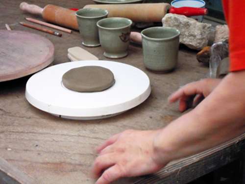まず土の2/3の量をろくろ臺の上に載せ、手で押し付けながら丸く広げ、さらに綿棒で延ばして底の部分を作ります。うどんを延ばす作業のようにも見えますが、案外均等に平らに延ばすのは難しいものです。また、ろくろ臺の中心に置かないとその後の成形作業がうまくいかないこともあり、なかなか気を使う作業です。