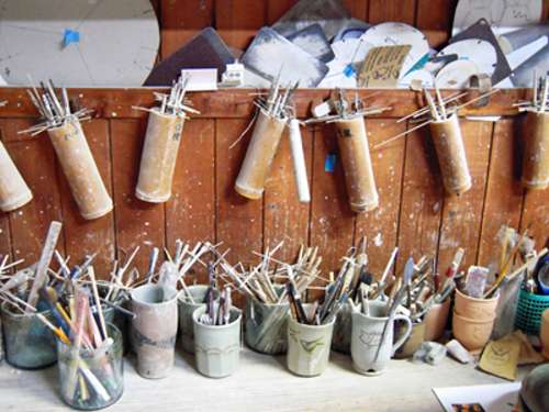 乾燥させなくてもそのまま描ける顔料を使って思い思いの絵を描くのですが、普段使い慣れない筆を使うのと、「失敗したらどうしよう」と手が震えるせいで、成形以上に難易度の高い作業です。コツは「腕を使って描いたらいいですよ」と、「色使いは1色か2色、多くてもちょっぴりアクセントを入れる色を含めて3色までにしたほうが洗練された仕上がりになりますよ」ということでした。