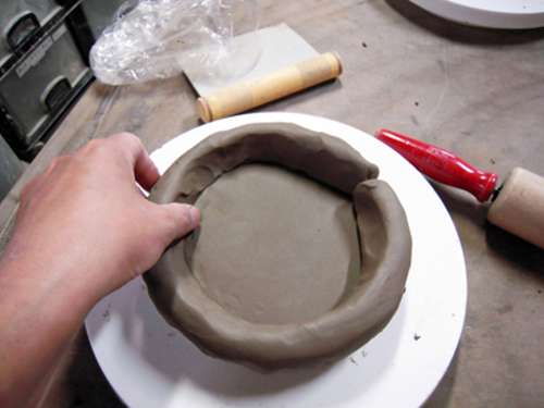 殘りの1/3の土は親指よりちょっと太いくらいの細長い紐狀にし、底の周囲にぐるりと載せて、指でしっかり押し付けていきます。今度はろくろ臺を手で回しながら丸く整え、最後にテグスや針金で余分な部分を落として成形が完成しました。
