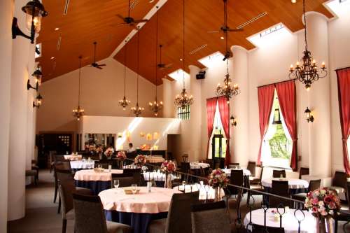 窓の外は深緑眩しい落葉樹林とその向こうに青く輝く豬苗代湖が見えます。晴れた日の夕方には、紅く染まる湖面を眺めながらのディナーがお灑落です。
