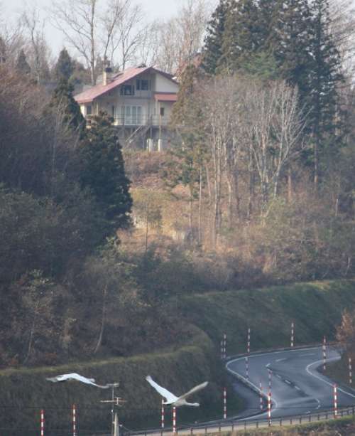 豬苗代ヒルズに出勤途中で分譲地の上空を飛ぶ群れを発見しました。左の寫真の背景がヒルトップです。別荘の前を橫切る寫真も欲しかったのですが急降下されて失敗しました(寫真右)。