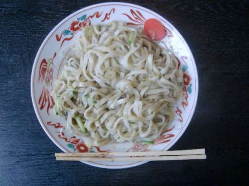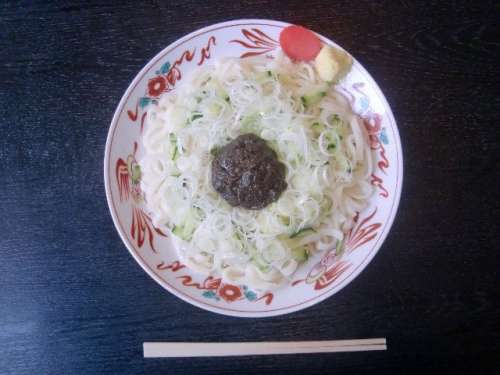 麺は平たく、きしめんかうどんのような獨特の麺でその上に特製の肉味噌とキュウリ、ネギをかけお好みでお酢、ラー油、ショウガ、ニンニクを混ぜ合わせて食べる食べ物です