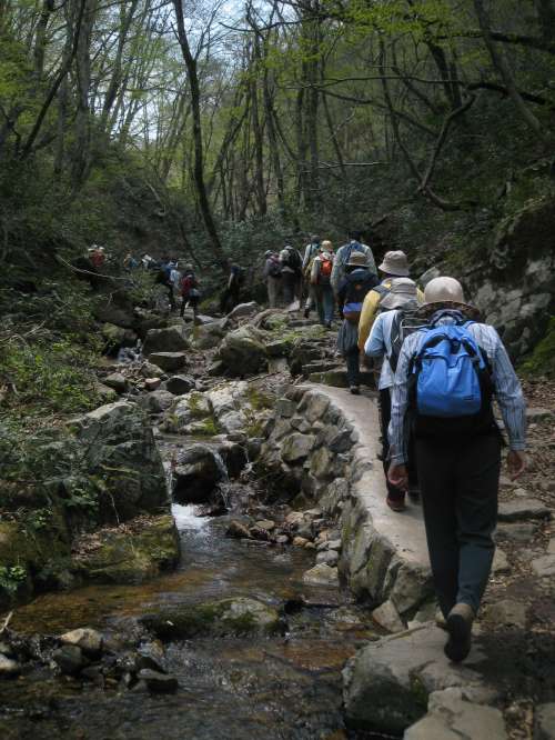 渓谷に沿って登るこのコースは     時には川をまたいでいくことも。