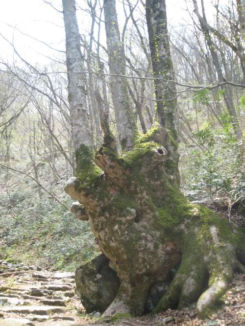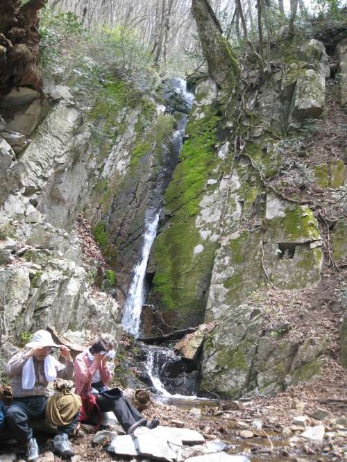 巖を飲み込んだ大きな樹木の根    途中に滝のある場所で休憩