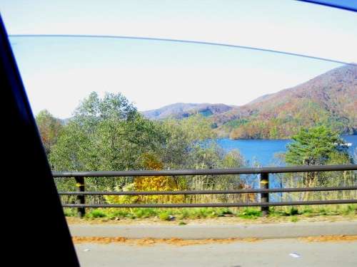 車窓よりうっすら秋元湖