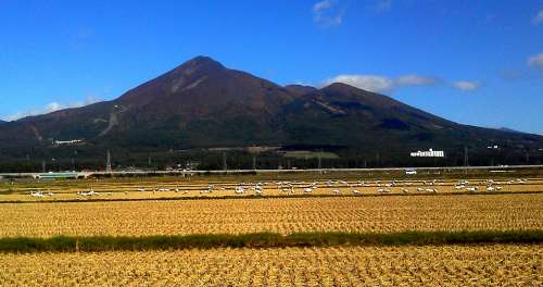 「お疲れ様!」と小さい聲で言いましたが白鳥は磐梯山に抱かれて美味しそうに落穂の食事を楽しんでいました