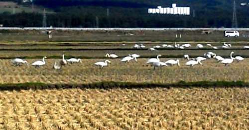 本日10月19日に分譲地麓の稲刈り後の田んぼで白鳥が落穂を食べていました