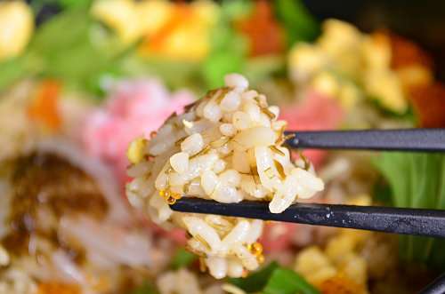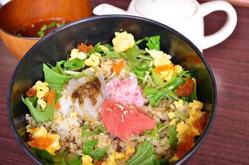 がごめ昆布は、函館の近海だけで獲れている珍しい昆布。粘り成分が普通の昆布よりも多く、その成分が體に良いとして様々な研究が行われています。「がごめ飯」には細切りのがごめ昆布がたくさん入っており、酢飯でさっぱりといただけます。鹿部産たらこ、かにのむき身、昆布締めイカがトッピングされているので、味の変化も楽しめます。