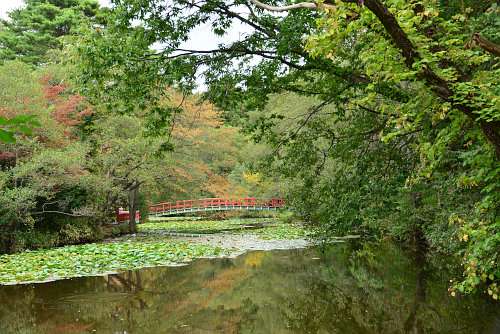 沼には何箇所かに赤い橋がかかっており、いろいろな場所から眺めてもほとんどの場合はその景色のどこかに橋の赤い色がアクセントとして入るようになっています。外來種のアメリカザリガニが沼に住み著いてしまったことから、市では「アメリカザリガニを釣ったら持ち帰って」と呼びかけており、たくさんの子どもたちがザリガニ釣りにチャレンジしています。