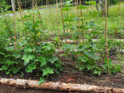 キュウリの畝。奇形果や色の薄い葉など肥料不足の兆候がでたのであわてて肥料を少し蒔いたところすみやかな改善が認められた。できれば肥料は使いたくないのだが...