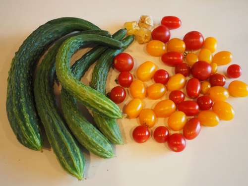 ある日の収穫(キュウリ、ミニトマト、食用ホオズキ)。左側のキュウリは通常市販されているキュウリの3倍ほどもある。