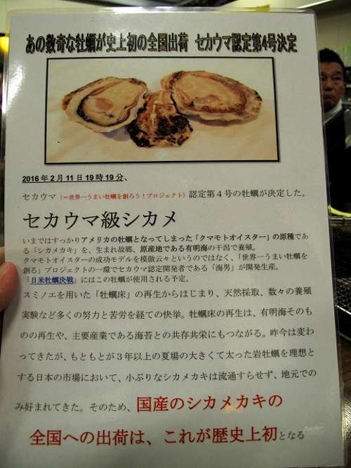 牡蠣(かき)で有名な広島県や福岡県の糸島などでは、 冬になると海沿いに「かき小屋」なるものが期間限定でオープンします。 とれたての牡蠣をその場の炭火で焼いて楽しむ、 いわば牡蠣などシーフードのバーベキュー小屋とでも言いましょうか…。 霧島市にも本場のかき小屋に負(fù)けないくらい美味しいお店が2015年2月、 霧島市國分川內(nèi)の田んぼの中にオープンしました。 そこで、オープンして一年経った「かき小屋匠ちゃん」へ出掛けてみました。 ここのお店は、 鹿児島県初のかき小屋として、また牡蠣は生食で食べられる數(shù)少ない海域を厳選し、 牡蠣の安心安全が確認(rèn)できた所の牡蠣だけを提供しています。 日本オイスター協(xié)會が認(rèn)定する、 「安全な牡蠣を美味しく楽しく提供する」スペシャリストで、 オイスターマイスターという牡蠣の資格をもつ「かき小屋匠ちゃん」のオーナー田中匠一郎さん。 「本物の生食用のみで勝負(fù)する國內(nèi)では數(shù)少ないお店。そのこだわりの牡蠣をご堪能して下さい。」と胸を張ります。 その牡蠣へのこだわりは、かなりのもの。 一年中食べられるよう旬の牡蠣を、日本各産地の異なる様々な種類の生食用の牡蠣を、焼きや生で提供してくれます。 牡蠣以外にも海鮮メニューをはじめ、 居酒屋メニューやステーキなどの肉メニューも充実。 メインの海鮮セットに鯵の開きと牡蠣釜飯を 追加。 なぜか和牛ホルモンも…。 牡蠣のみならず、 全ての食材はオーナー自ら厳選したものを 提供しているそうです。 かき小屋で焼けば、バ ーベキュー気分でお隣さんとも思わずニッコリ! 訪れたこの日、 提供されたのは、九州のカキ決定戦でグランプリを受賞した五島列島の山田さんの牡蠣でした。 店主が自ら生産現(xiàn)場に赴き、吟味した極上の牡蠣を用意してくれるこだわりようです。 「かき小屋匠ちゃん」オーナーの田中さんが「もうすぐ、こんな牡蠣が食べられるようになるんですよ」と一枚のビラを見せてくれました。そこには“シカメ”と書かれていました。“シカメ”とは「シカメカキ」とのこと。 「シカメカキ」には數(shù)奇な歴史があります。第二次大戦終戦直後にさかのぼります。 アメリカでの牡蠣の食文化は歴史は長く、世界一牡蠣を食べる國と云われるほどです。その頃のアメリカでは、亂獲や冷害などで牡蠣が足りなくなっていました。 アメリカの統(tǒng)制下だった 日本に対し、GHQ司令官の マッカーサーは「日本のカキをアメリカへ送れ」という指令を出します。 そこで、いろんな産地の牡蠣が試される中、 熊本県産の小ぶりな「シカメカキ」が人気を博しアメリカ市場に出回りました。 當(dāng)時(shí)「シカメカキ」は「西方の寶石」「カキの女王」「幻のカキ」などと呼ばれるほどになりました。 一方、日本國內(nèi)では小型の「シカメカキ」の人気は出ず、國內(nèi)用に養(yǎng)殖される機(jī)會もないまま、熊本県のカキ養(yǎng)殖業(yè)界は衰退し、アメリカへの輸出も完全になくなりました。 それから數(shù)十年、2005年から、熊本県をあげての「シカメカキ」を見直そうと、プロジェクトがはじまりました。 そして、2016年2月、熊本有明産の牡蠣でありながらアメリカのブランド牡蠣として、運(yùn)命をたどった牡蠣、「シカメカキ」が史上初、全國初出荷になるそうです。 もちろん、ここ「かき小屋匠ちゃん」でも2月下旬から 頂くことが出來ます。 春先からが旬の「シカメカキ」また食べにこよ~っと!