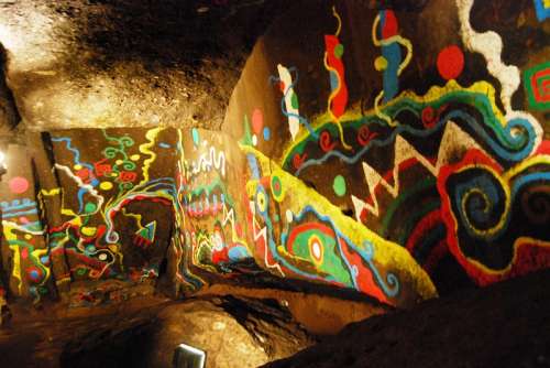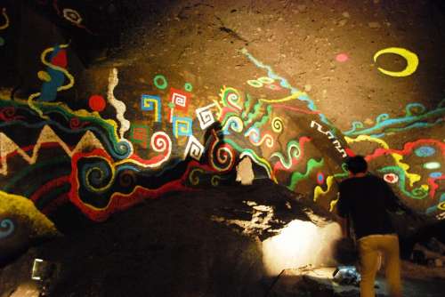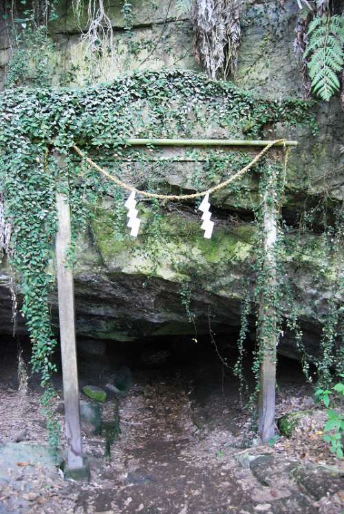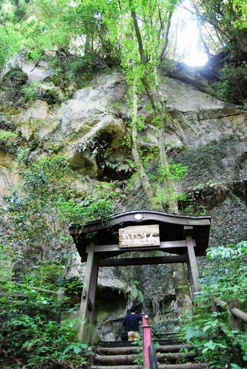 現(xiàn)在の霧島市の國分平野には 古代神話で “熊襲”(くまそ) と呼ばれた部族が住んでいました。 (後に 隼人族の祖とも言われています) 熊のように猛々しく、勇ましい人々だったとされ、大和朝廷に抵抗し、 景行天皇の息子:日本武尊(やまとたけるのみこと)の熊襲討伐の物語は 古事記や日本書記にも登場します。 その熊襲族が住居していた穴とされる 「熊襲の穴」は、 霧島市隼人町の「妙見溫泉郷」にあります。 熊襲の首領(lǐng):川上タケルが 女裝した日本武尊によって殺害されました。 この時、川上タケルが息絶える直前に 日本武尊と命名したことから、一名嬢著(じょうちゃく)の穴ともいわれます。 國道223號沿いに案內(nèi)表示があり、 そこから山道を上って行きます。 辿り著いたのは 大きな巖肌の下に少し空間が空いた場所。 身をかがめながら巖の隙間から中に入ると、 大きな空間が広がります。 奧行き22メートル、幅10メートル、高さ6メートルの広さだそうです。 壁には鹿児島県出身の 前衛(wèi)畫家:萩原貞行氏が 古代熊襲族をイメージした様々な図柄が描かれた 秘的な空間です。 これは 熊襲の住居というよりも、 神事をなど執(zhí)り行ったところではないかと感じました。