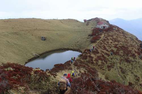 三嶺山頂直下には池と立派な無(wú)人小屋がある。