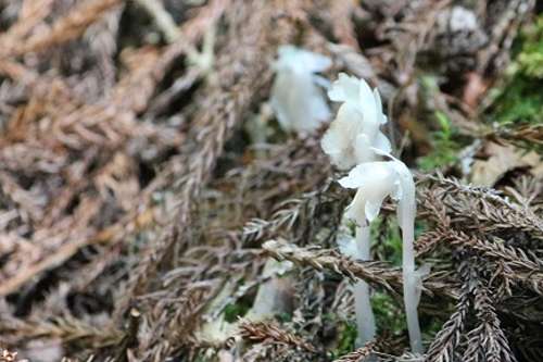 杉の落ち葉を割ってギンリュウソウが咲いていました