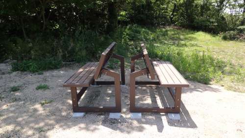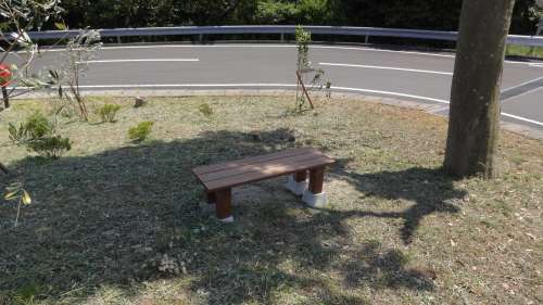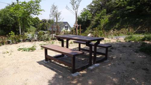 ここは憩いの広場として、木陰で休むことができるようにテーブルベンチを設置しました。