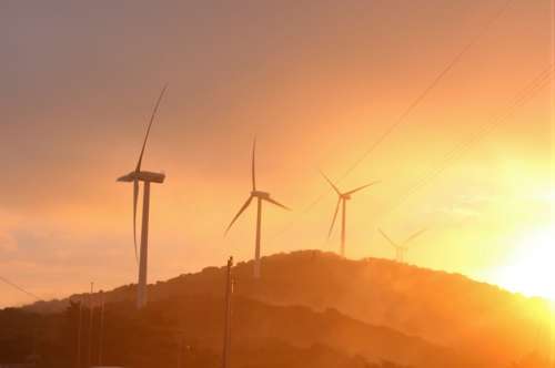 夕日に染まった雲が風車にかかり