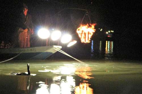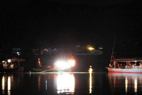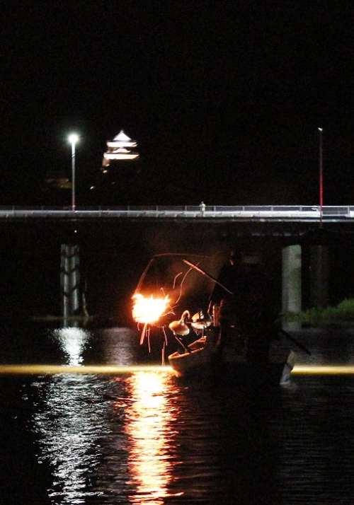 漁火を炊いた鵜飼い船の向こうに見えるのは
