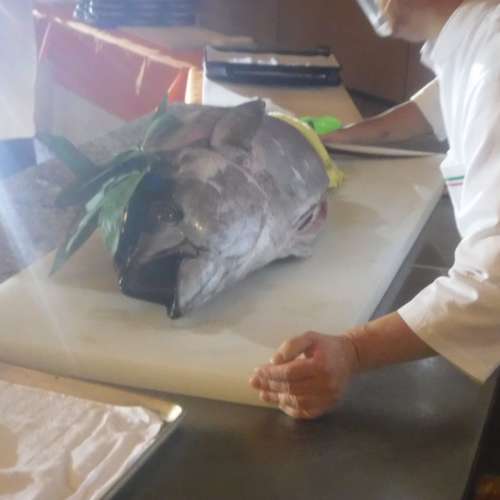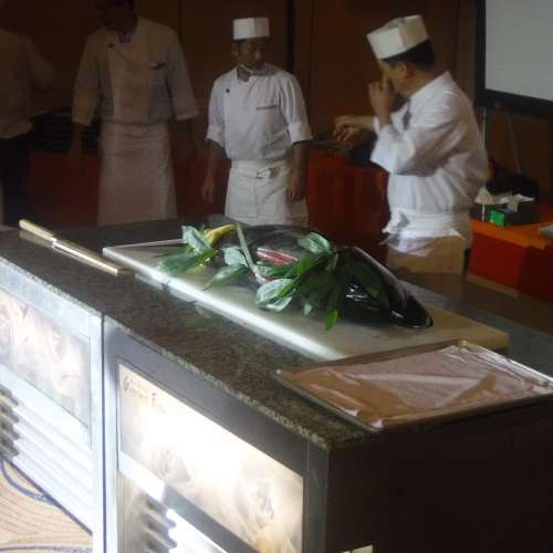 オーナー様も前に出て寫真撮影    早速、マグロの刺身をご賞味いただきました