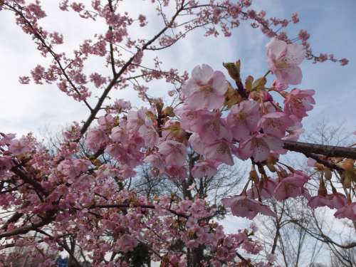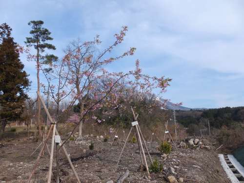 大山ガーデンプレイス前、枡水高原に向かう交差點の一角。 1年前に、「ブナを育成する會」の吉岡さんが中心となり 河津桜30本が植樹されました。