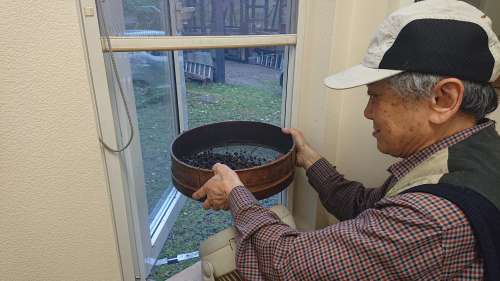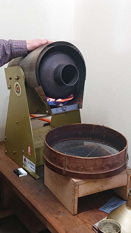煎った後は送風(fēng)機(jī)で殻を飛ばします