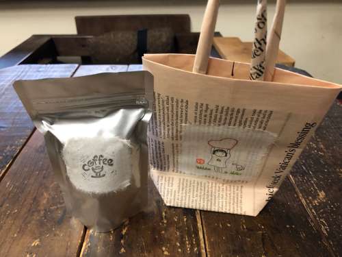 煎りたてのコーヒーをその場でいただくだけでなく、殘ったコーヒーはこのようにパックに詰めて持ち帰りすることができます