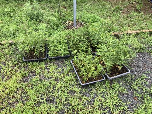 先ほどの水用ホースに沿って、格子のマス目に株を植えてゆきます。
