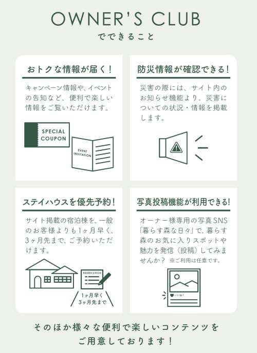 この度私たちは、森林住宅地での住まい方を 森を間借りする暮らし「暮らす森」と銘打ち、 オーナー様會員サイト「暮らす森 OWNER’S CLUB」 をオープンいたしました。