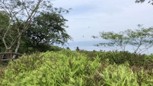 宇和海をバックにフジバカマと中央付近、空に點(diǎn)が2つあるのがアサギマダラです。