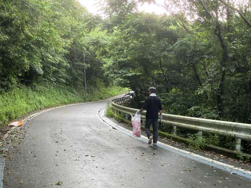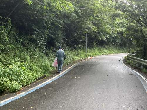 畫像中央道路に置いてあるビニールが集めていただいたゴミです。