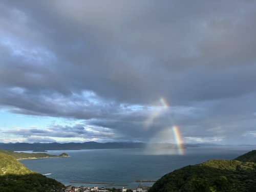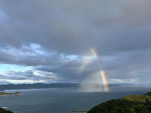 そんな時(shí)、亀ヶ池溫泉の先の海上に珍しい虹を見(jiàn)ました。