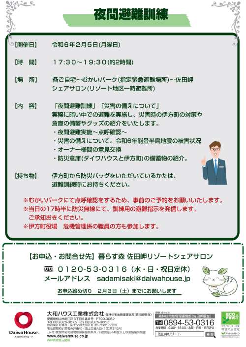 ます。いざという時に備えて佐田岬リゾートオーナーのみなさまと避難訓練を実施したいと