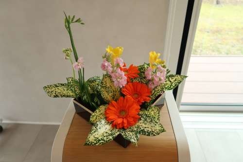 今月はガーベラ?ストック?フリージアなど春らしい花材を使います。