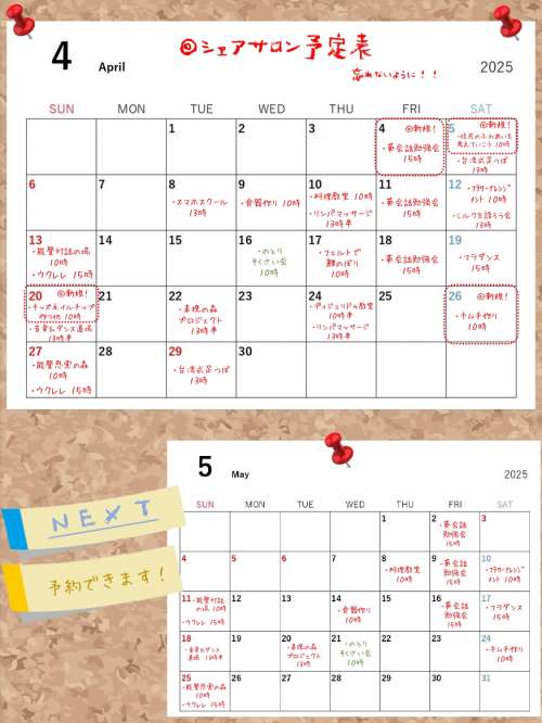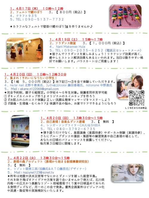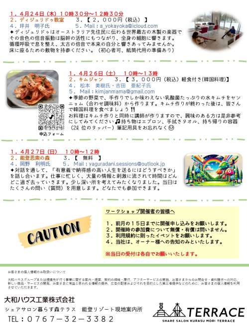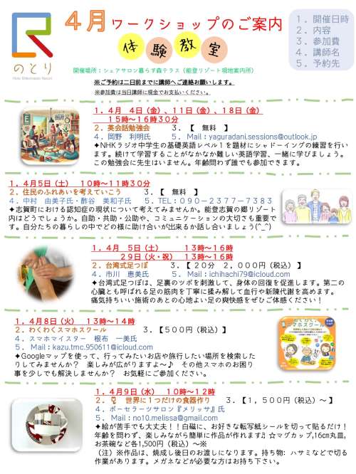 シェアサロン暮らす森テラス【4月ワークショップのご案內】