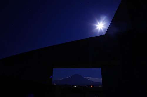 建物をフォルムに大山と満月を撮影。 植田正治寫真美術館で撮影するueda-choな風景。 別荘地より約3.6km 平成23年9月12日撮影
