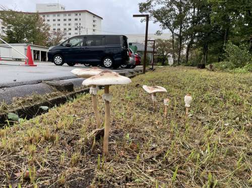 立冬が過ぎ、これから寒い季節になりますね。 雨が降り気溫が下がると、能登志賀の郷リゾートにもきのこが出てきました シェアサロン暮らす森テラス駐車場に不気味なきのこを発見 まるでアニメにでもでてくるような、大きな白い傘のきのこ🍄 背丈もあり、かなり大きいです このきのこの名前は分かりませんが、食用ではないので鑑賞するだけ きのこを食す時はきちんと調べてからにしましょう ※上記寫真は令和6年10月撮影
