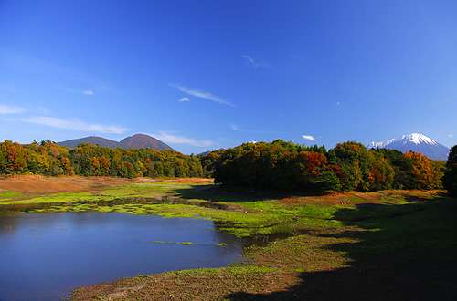 岡成池 米子ICから大山へ向かう途中にある名物展望駐車場。 周辺の紅葉とのコントラストが絶妙です。 (別荘地より約6.2km 平成22年11月9日撮影)
