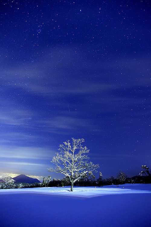 大山まきばみるくの里、その芝生広場(chǎng)に立つ一本の木。 冬を懸命に生きるその姿にスポットライトがあたっているようで何だか神秘的。 その上を偶然に流れ星が???。。