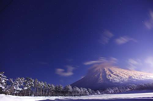 大山放牧場(chǎng)まで近づくとスキー場(chǎng)のナイター照明、 月明かりも重なりかなり大山がくっきり。星空との共演も見事です。