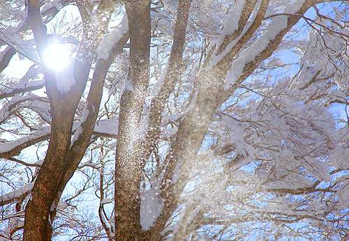 大山の中腹、木々の中で偶然にも遭遇したダイヤモンドダスト!? 実際は風(fēng)に舞う雪の粒。太陽(yáng)に照らされた雪の粒が寶石の輝きに。