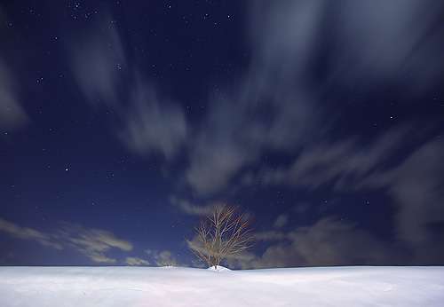 雪原に立つ一本の木。星空や流れ雲(yún)の下に立つ木の存在感たるや。