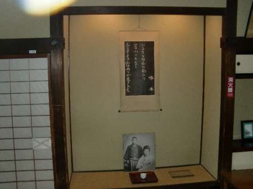 啄木と妻の節(jié)子の寫真が展示されており、床の間には啄木の有名な詩が飾られています