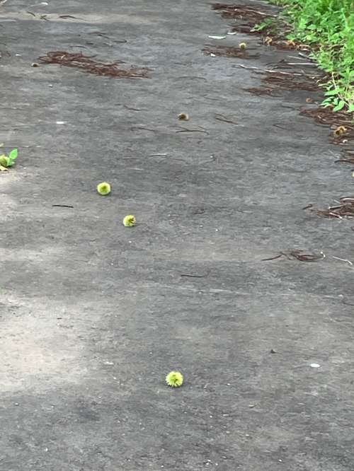 歩道に、何やら緑色の小さな丸いものを発見しました。