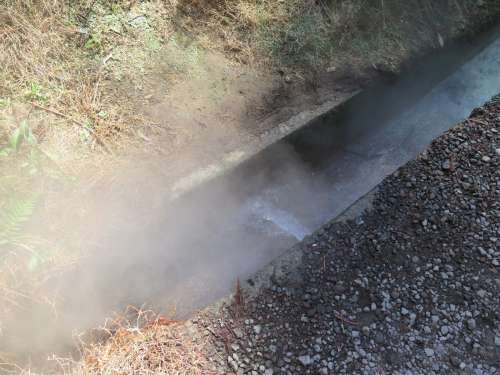 硫黃の匂いが漂ってくるではありませんか。周囲を観察すると側(cè)溝から湯気が