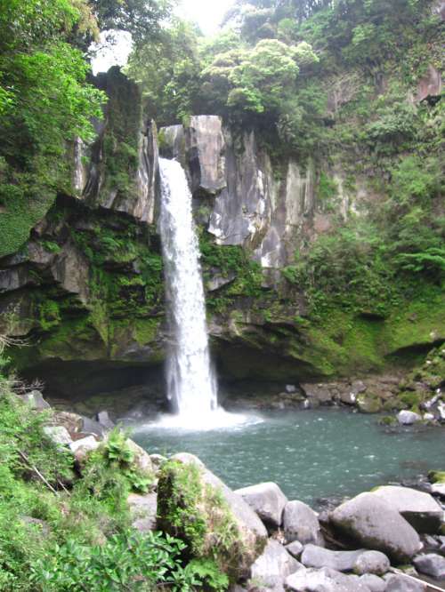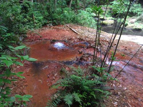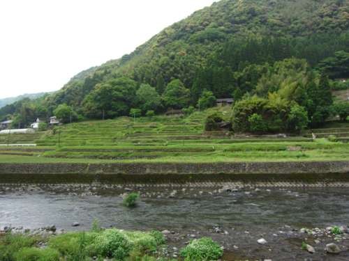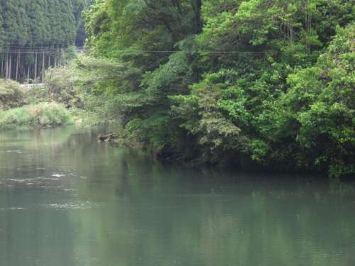 ここは、霧島妙見臺からほど近い、霧島川の風(fēng)景です。 川の向こう岸には段々畑が広がります。 ここは2つの川が合流する地點です。 左に上ると天降川、右に上ると霧島川です。 今日は、左の天降川を遡りました。 前日の雨で少し濁っていますが、川面に新緑が映り込みます。 溫泉地である霧島では、至るところに溫泉の源泉が湧き出ています。 寫真左側(cè)に見える赤茶色の部分は、源泉が流れ出ている場所で、 泉質(zhì)の鉄分により、巖壁が変色しています。 見えるでしょうか? 魚の種類は分かりませんが、 いました。