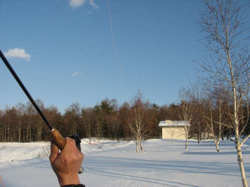 練習には前と後に10m、合計20mもの広いスペースが必要になります、森林住宅地ではこのぐらいのスペースの確保は難しくありません、さらに雪に覆われた地面は樹脂コーティングされたフライラインをアスファルトや土の摩擦から守ってくれます、まさにこの上ない練習環(huán)境です