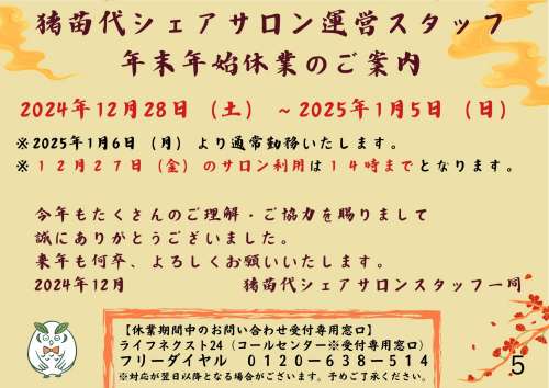 豬苗代シェアサロン 年末年始休業日のお知らせ