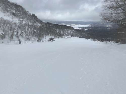ゲレンデの向こうに雪に覆われた檜原湖が見えます。